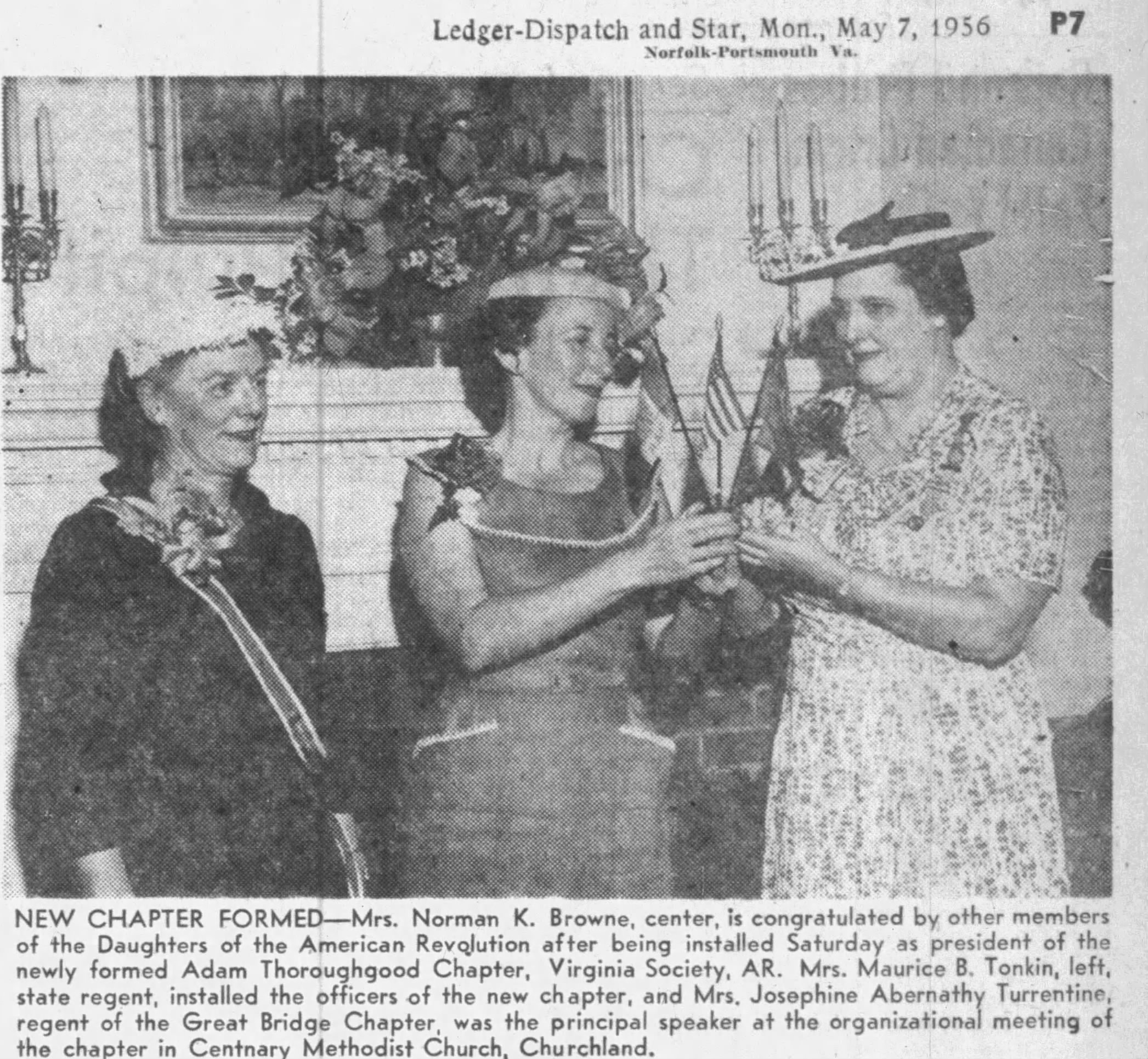 On May 5, 1956, at the inaugural meeting of the Adam Thoroughgood Chapter, Virginia Society, DAR, thirteen charter members witnessed the installation of the following officers: Regent, Mrs. Norman K Browne; Vice Regent, Mrs. J. Hubbard Davis; Secretary, Mrs. Robert L. Long; Treasurer, Mrs. William P. Carver; Registrar, Miss Shirley Virginia Parrish; Historian, Mrs. Henry H. Gooch III; Librarian, Mrs. Marcel Y. Carpenter; and Chaplain, Mrs. James Bolton Jr. Ledger-Dispatch and Star, Mon., May 7, 1956